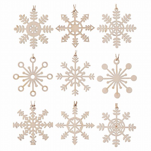 9種類の美しい氷の結晶柄のナチュラルな木製オーナメント。