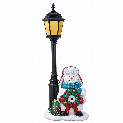 街灯の下にちょこんと座る雪だるまのオブジェです。