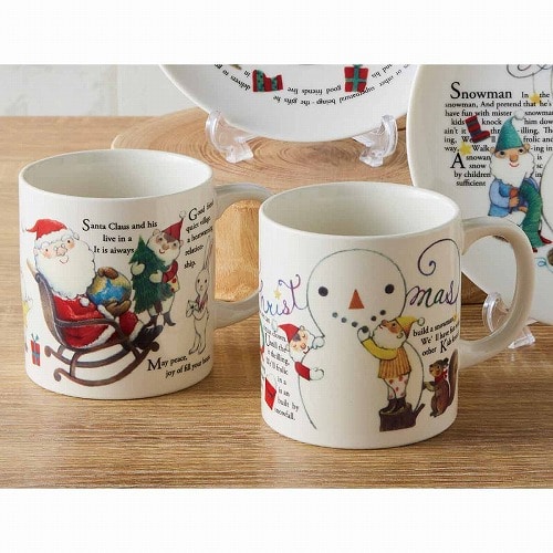 サンタクロースや雪だるまのかわいい柄の陶器のマグカップです。