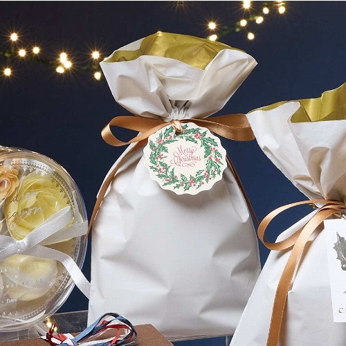 リボンを絞るだけで簡単にラッピングができ、クリスマスプレゼントのラッピングにおすすめのおしゃれな包装資材です。