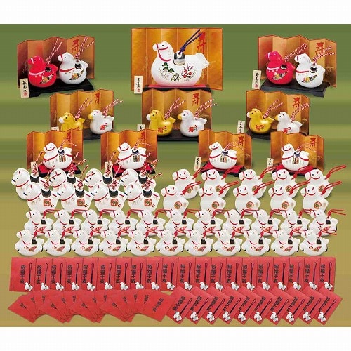 くじと抽選箱付きなので、このセットだけで抽選会イベントが開催できます。景品は干支(午)のおまもりや鈴の縁起物。