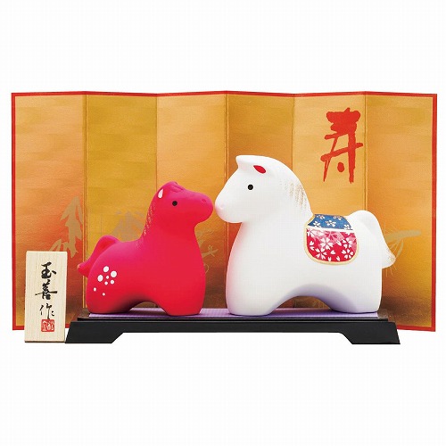 金屏風に「寿」の文字が輝く紅白の愛らしいうまの置物セットは、新年のお祝いムードを高めるにふさわしい縁起物です。