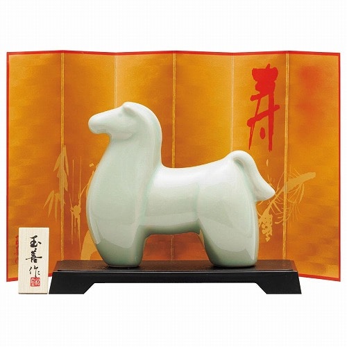 2026年の新年のご挨拶は、縁起の良い干支(午)ノベルティで。販促品や粗品に最適な開運や商売繁盛を願う置物です。金屏風に「寿」の文字が輝く白いうまの置物は、新年のお祝いムードを高めるにふさわしい縁起物です。