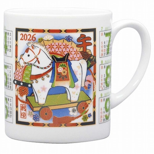 2026年の新年のご挨拶は、縁起の良い干支(午)ノベルティで。販促品や粗品に最適な、開運や商売繁盛を願うお正月にぴったりのカレンダー付き干支のマグカップです。