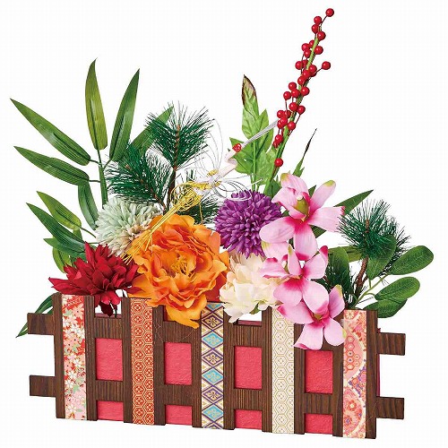 伝統的な松竹梅(松・竹、梅に見立てた花)に加え、鮮やかな椿や菊、南天の実を組み合わせた華やかな造花アレンジです。和柄の装飾が施されたフレームが和モダンな雰囲気を演出。コンパクトながらも存在感があり、お客様の目に留まりやすいデザインです。