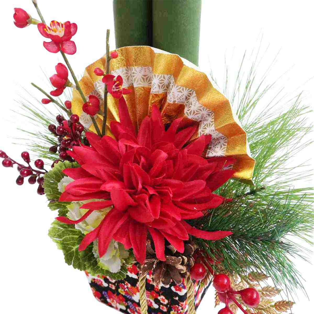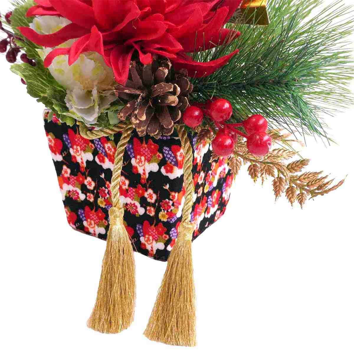 アーティシャルフラワーをあしらったエレガントな門松アレンジメント。