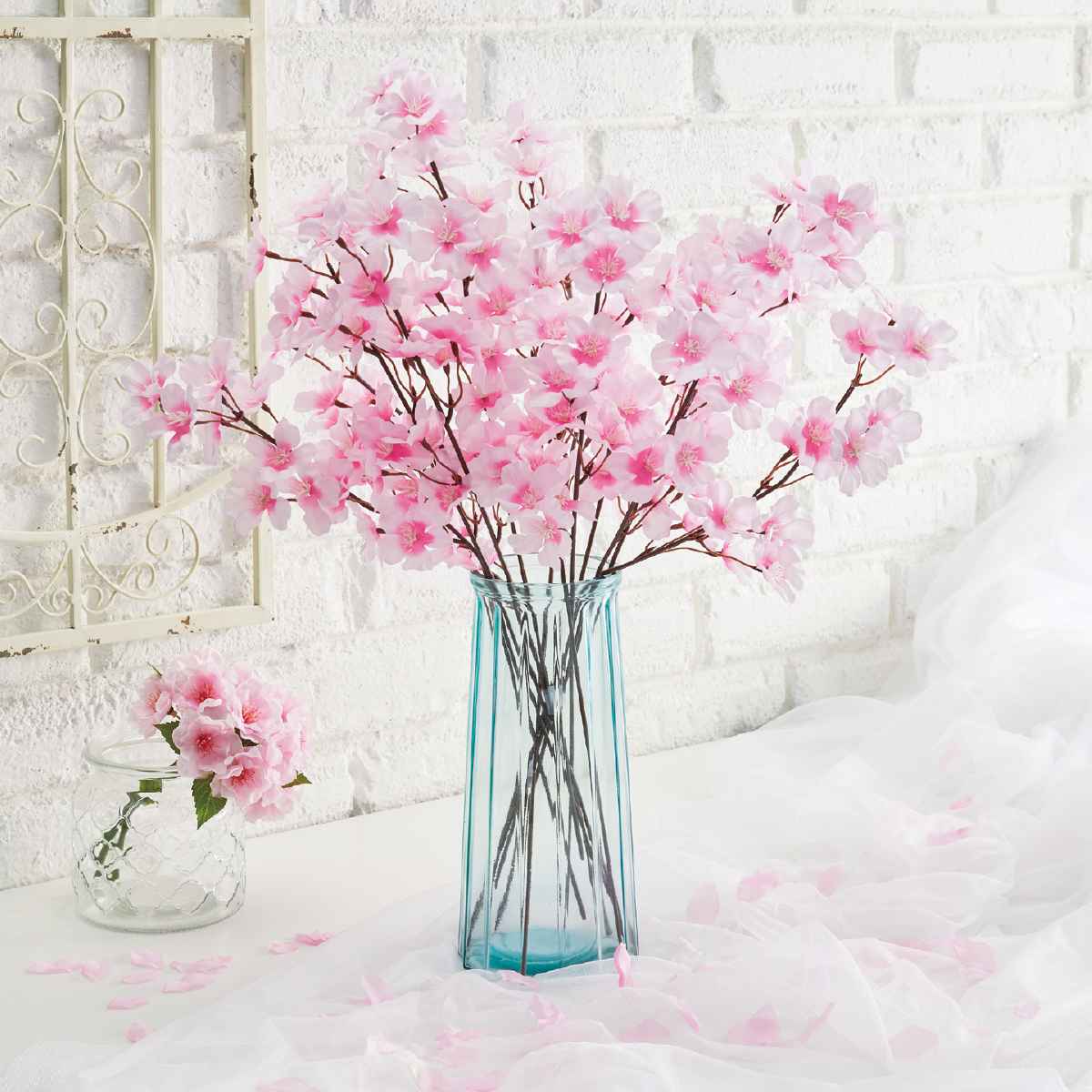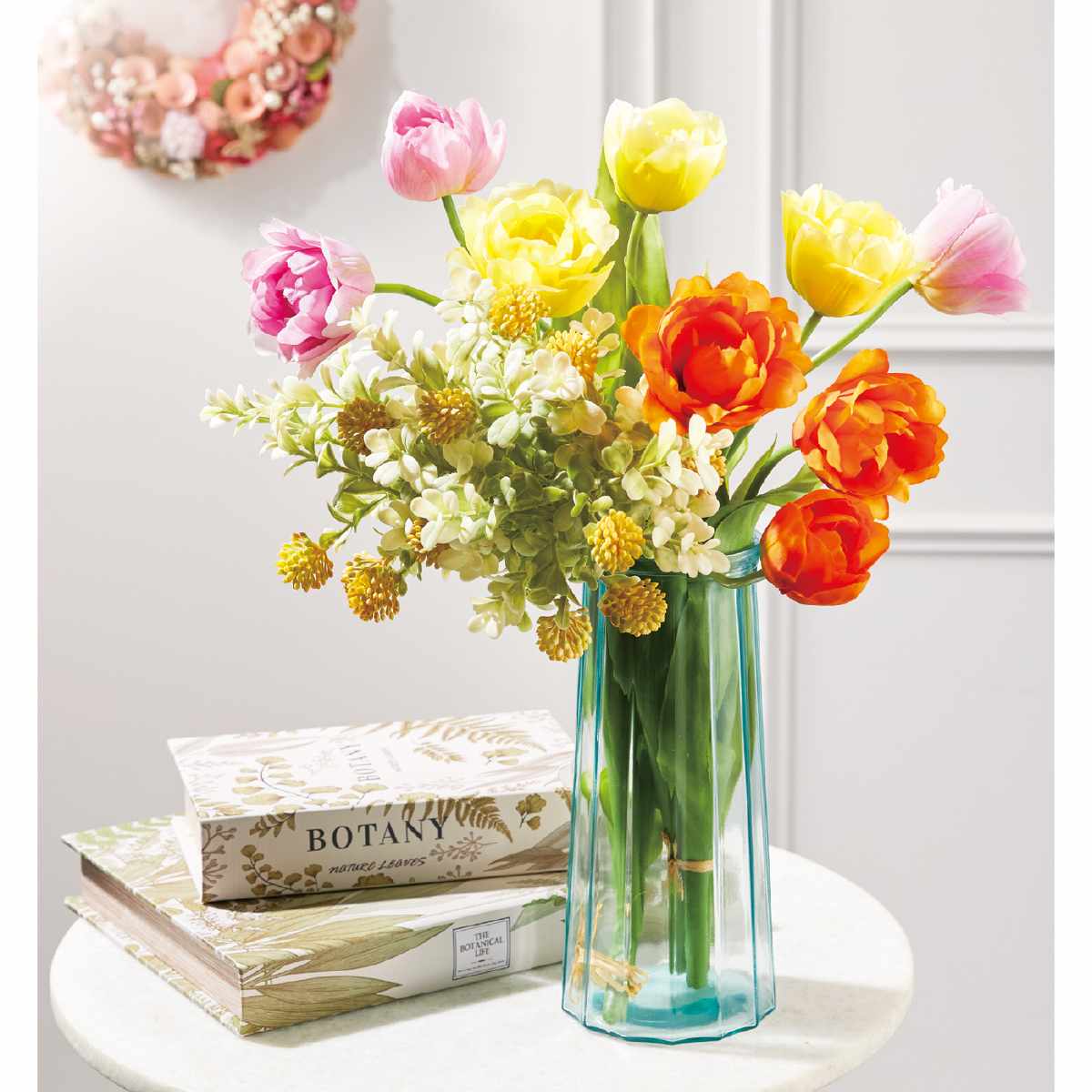 ミモザやチューリップなど春の造花を挿して春らしい店舗ディスプレイに。