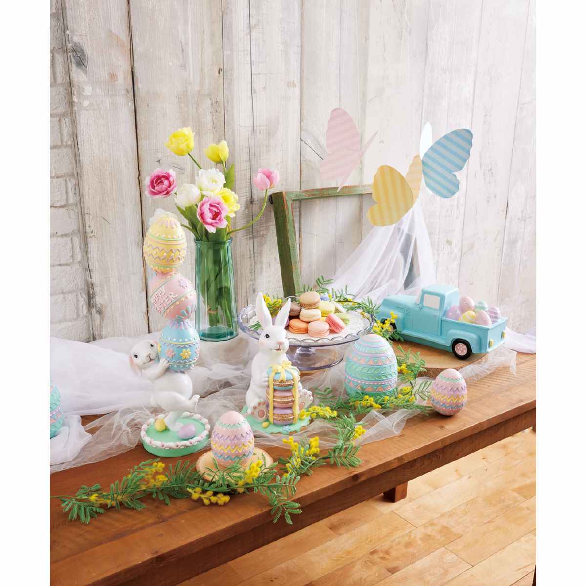 商品棚に置いたり、ワゴンや看板に巻いたり、壁に吊るしたり、春らしい店舗ディスプレイに。