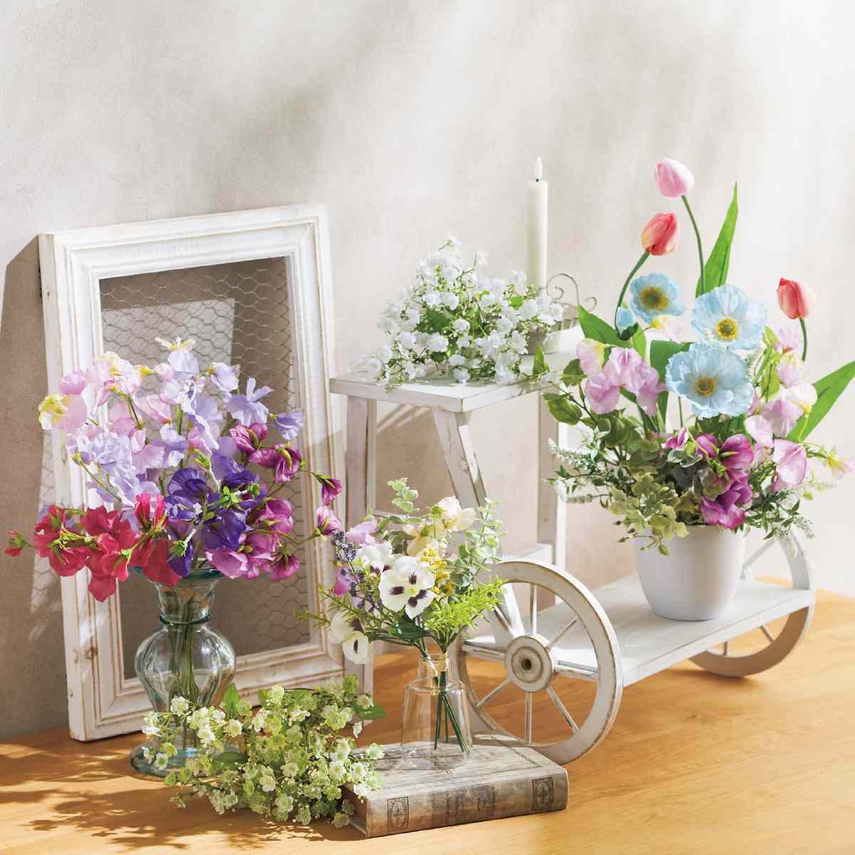 このまま置いたり、花瓶に挿して飾ったり、テーブルやレジカウンターに造花を飾って春らしいディスプレイに。