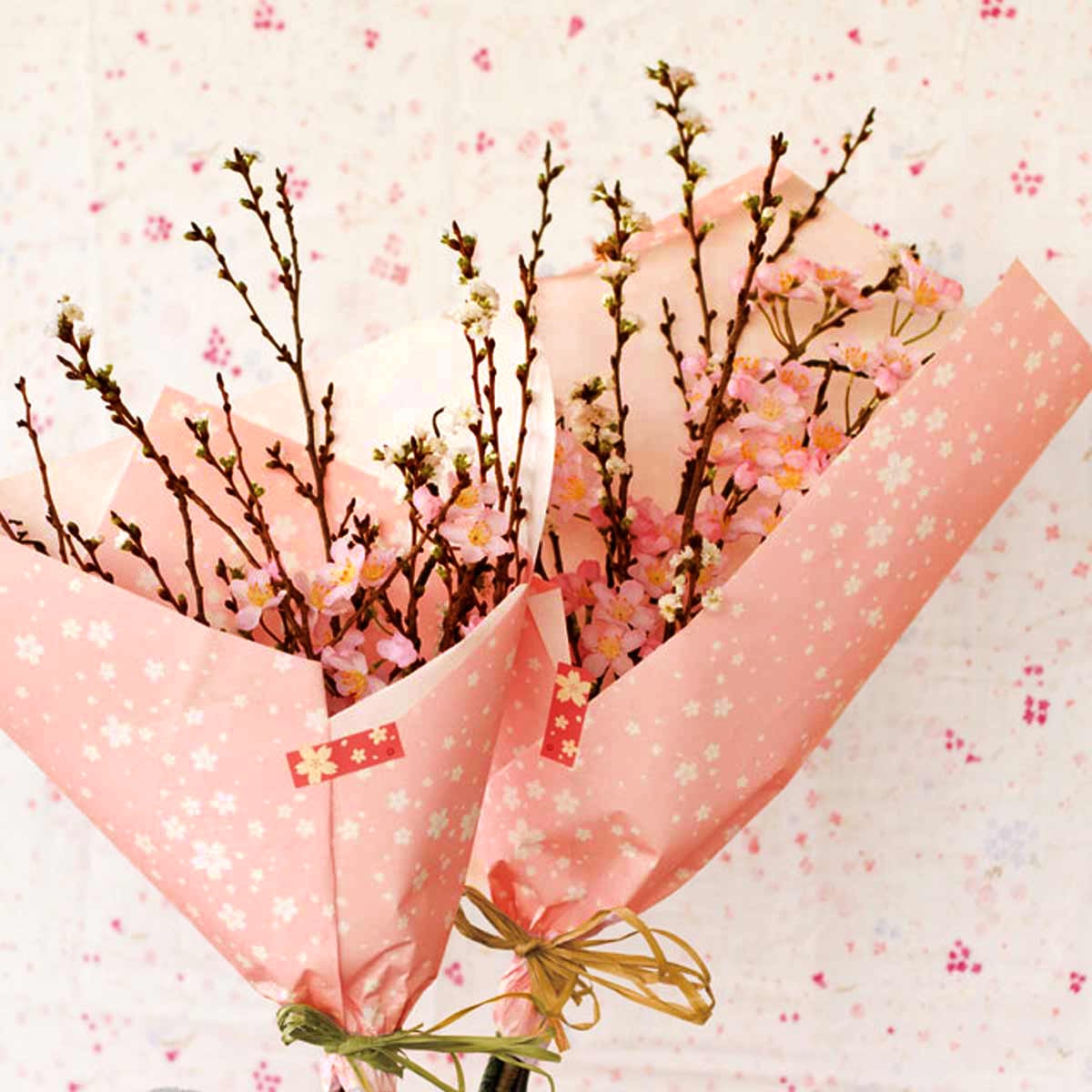 やさしいピンクの花柄包装紙は祝い事にもぴったりです。