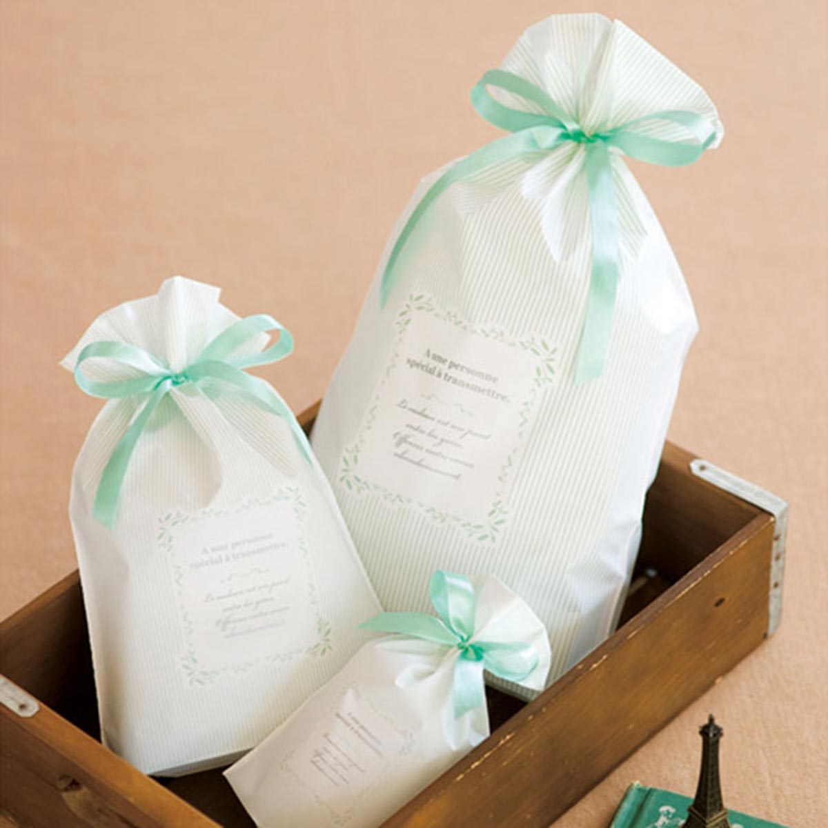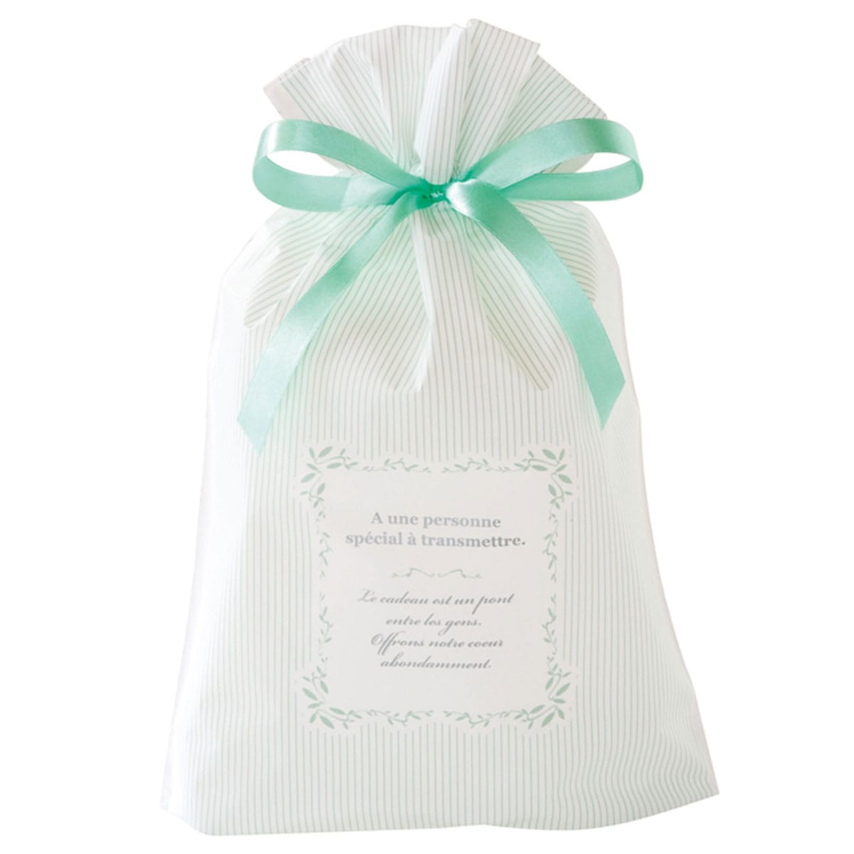 淡いミントグリーンのストライプが爽やかなリボン付きギフトバッグはホワイトデーのプレゼント用におすすめ。