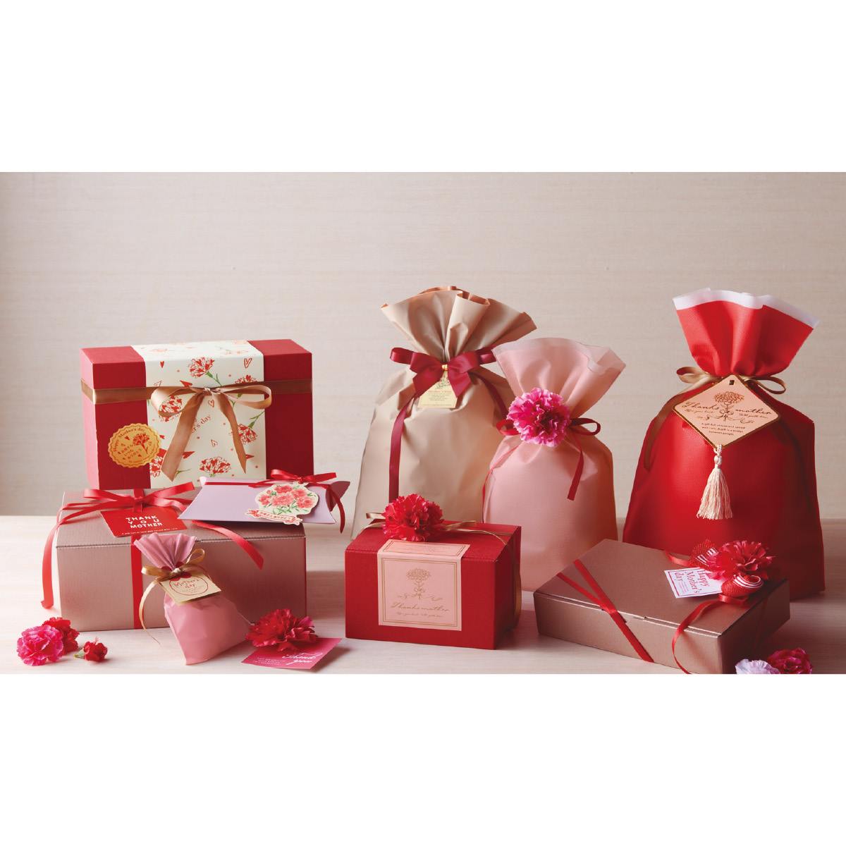 いつもお使いいただいているギフトボックスやバッグにつけるだけで、簡単に母の日ギフトのラッピングが完成です。