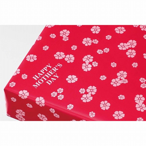 赤い包装紙に薄ピンクのカーネーションと「HAPPY MOTHER'S DAY」の文字がプリントされた包装紙。