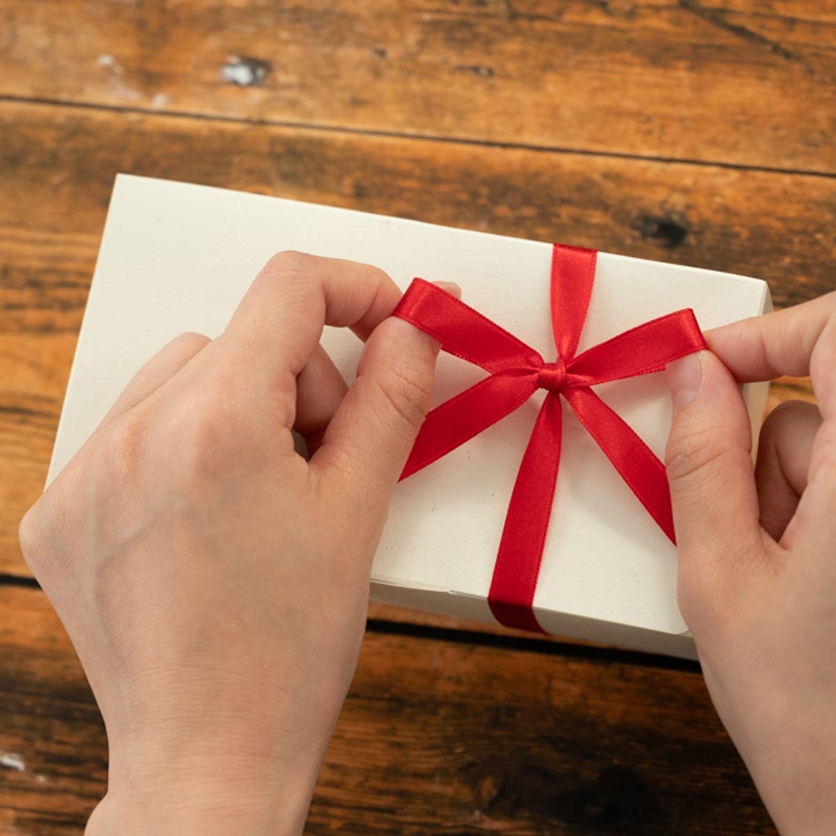 母の日やバレンタインのプレゼントラッピングにおすすめの赤色のサテンリボン。