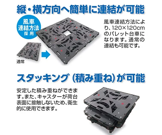 ●荷台表面が汚れずに積み重ね可能。(荷台表面にキャスターが接触しないため衛生的に使用できる。)