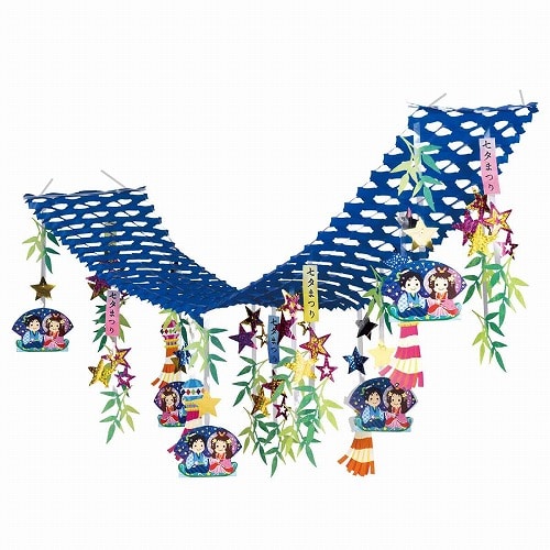 青い夜空に笹の葉や織姫と彦星の付いた賑やかな飾りです。