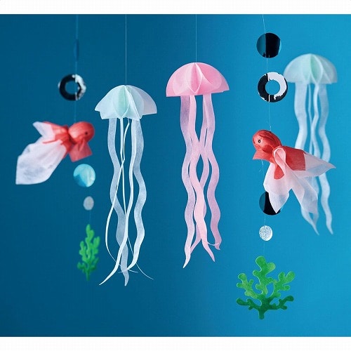 吊り下げ式のテグス付きで、天井から吊るすと金魚がゆらゆら揺れてかわいい飾りです。