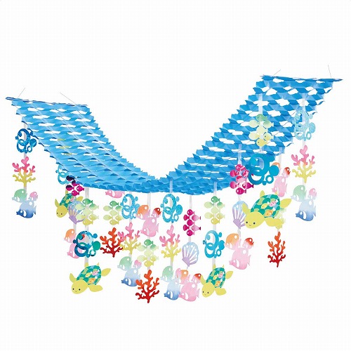 海モチーフのプリーツハンガーを天井に飾って夏らしいディスプレイに。